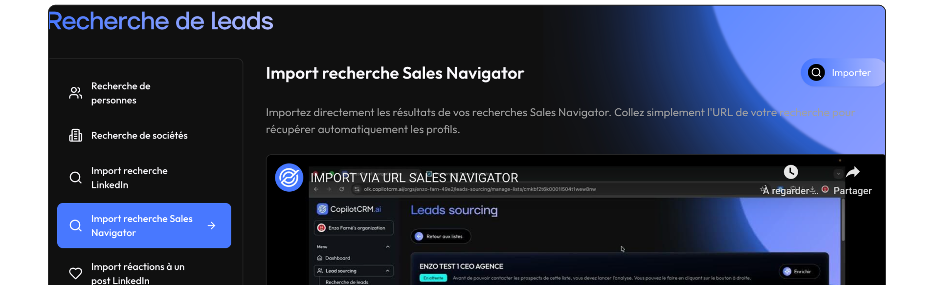 Sourcer vos leads via 5 méthodes, sans sortir de l’outil: import csv, import depuis une url linkedin ou sales navigator, recherche dans notre base, et récupération des personnes qui ont liké ou commenté un post linkedin.